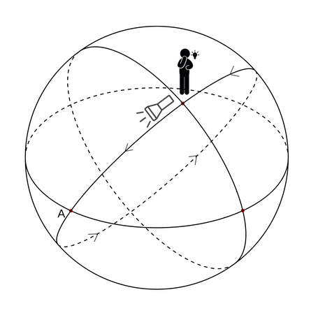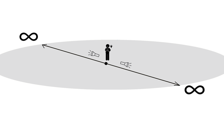 Rozważmy najpierw uproszczoną sytuację. Żyjemy na płaskiej, nieskończonej dwuwymiarowej płaszczyźnie. Pamiętajmy, że sami też jesteśmy dwuwymiarowi. Wypuszczamy z latarki promień światła w dowolnym kierunku. Leci on z prędkością światła w nieskończony obszar płaszczyzny i nigdy do nas nie powróci. Podobnie można przeprowadzić to doświadczenie w płaszczyźnie o trzech wymiarach i skutek będzie identyczny.